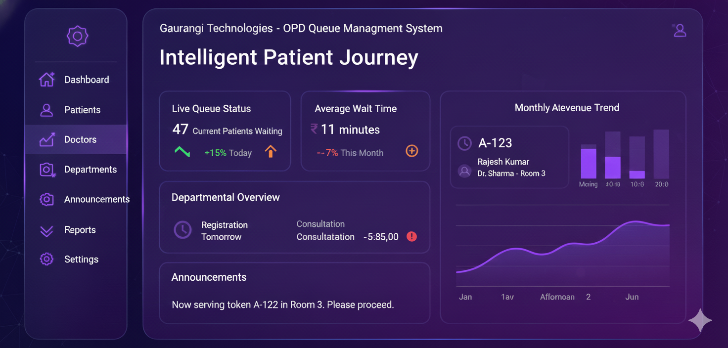 Our OPD Queue Management System is a sophisticated SaaS solution designed to eliminate waiting room congestion and enhance the patient experience. By digitizing the flow of clinic and hospital operations, we ensure that healthcare providers can focus on care rather than crowd control.